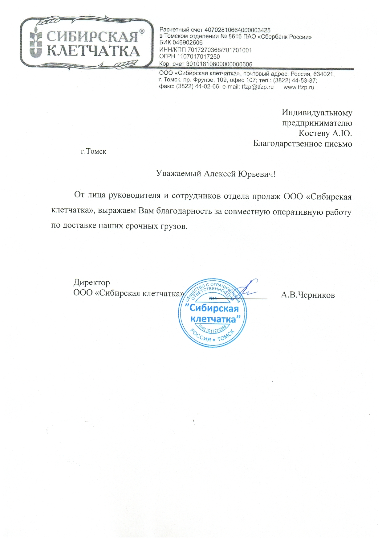 От лица руководителя и сотрудников отдела продаж ООО «Сибирская клетчатка», выражаем Вам благодарность за своевременную оперативную работу по доставке наших срочных грузов.