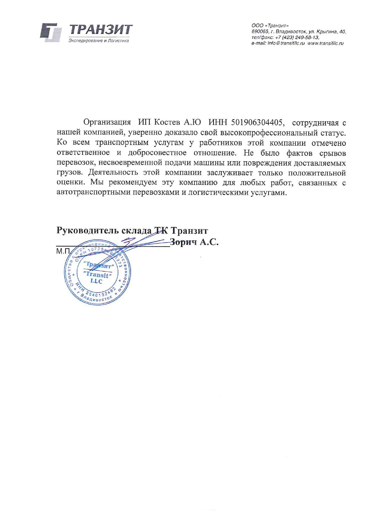 Организация ИП Костев А.Ю., сотрудничая с нашей компанией, уверенно доказала свой высокопрофессиональный статус. Ко всем транспортным услугам у работников этой компании отмечено ответственное и добросовестное отношение. Не было фактов срыв перевозок, несвоевременной подачи машины или повреждения доставляемых грузов. Деятельность этой компании заслуживает только положительной оценки.